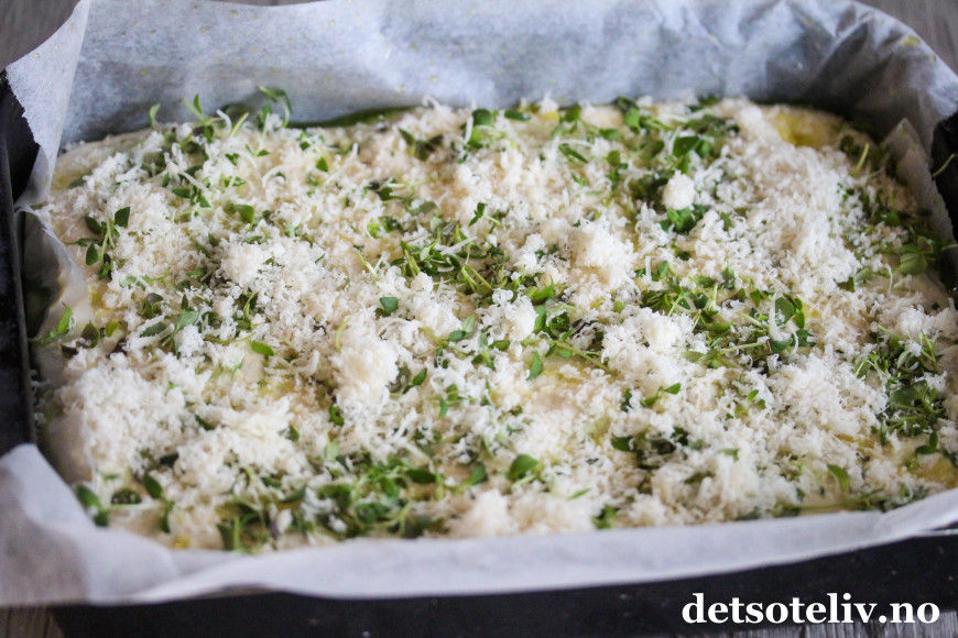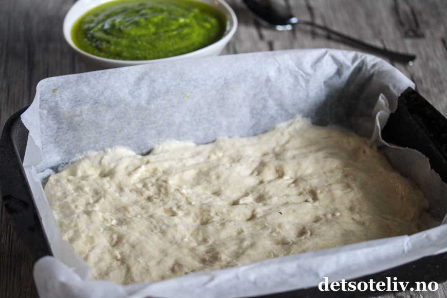 Kle en liten langpanne (ca 20 x 30 cm) med bakepapir. Hell halvparten av deigen i langpannen. Deigen er klissete, men ha godt med olivenolje på fingrene, og da går det fint å trykke deigen utover i langpannen.