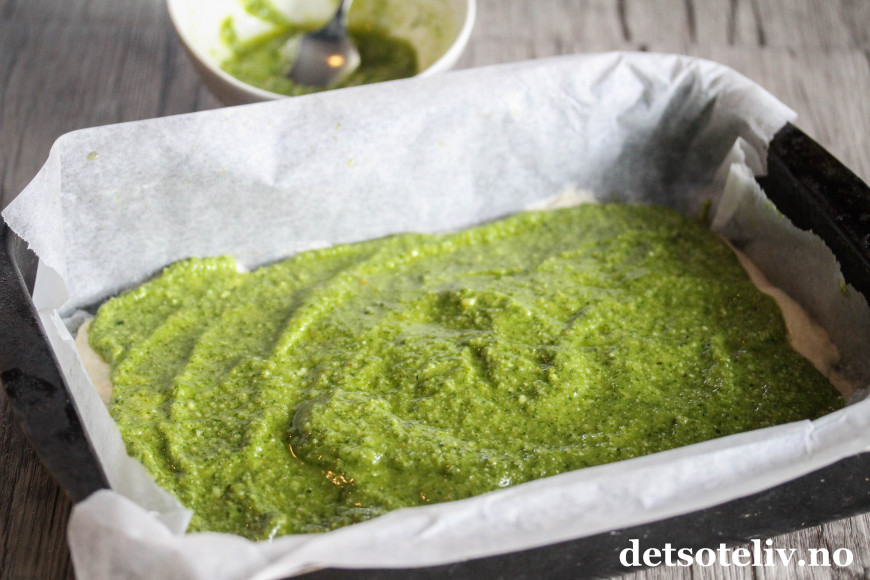 Smør pesto over deigen. Jeg bruker som sagt ikke hele porsjonen, men dekker med et nokså tykt lag. Det meste av pestoen vil trekke inn i deigen under stekingen.