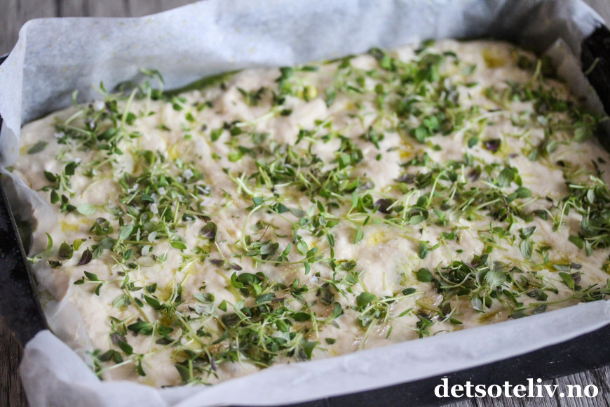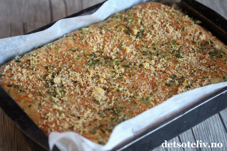 Stek focacciaen midt i ovnen ved 180°C i ca 30 minutter, til focacciaen er gyllen og gjennomstekt.