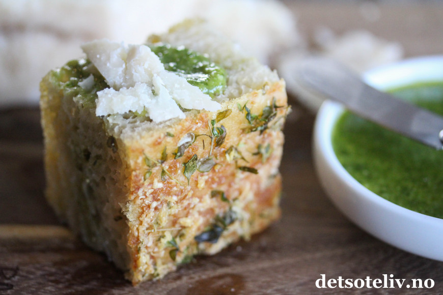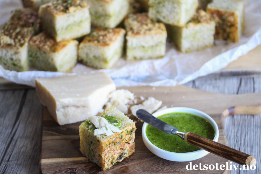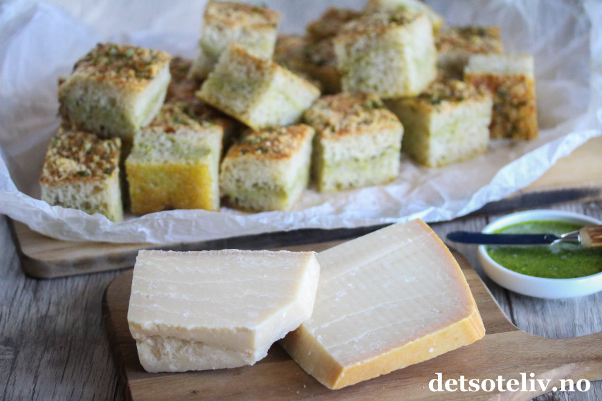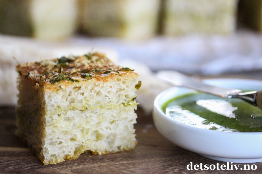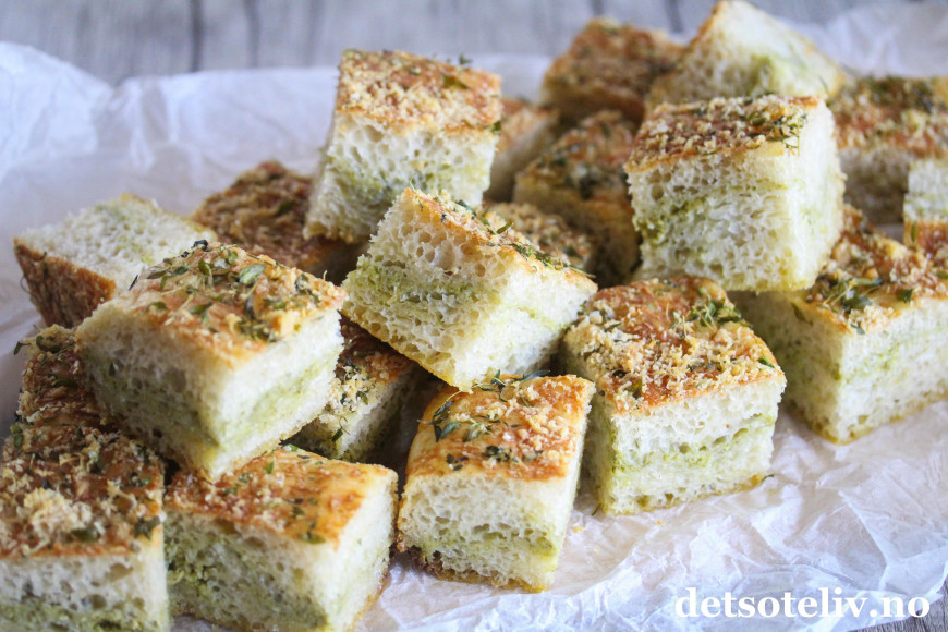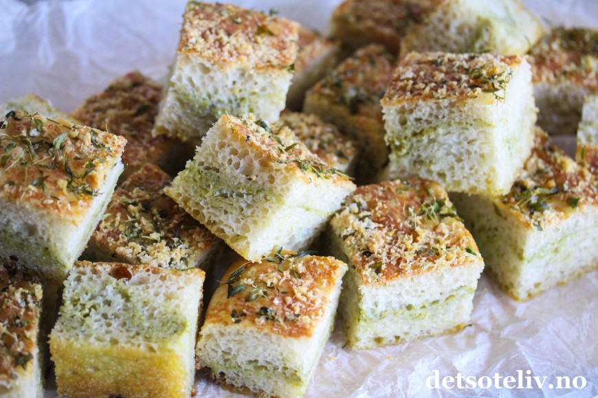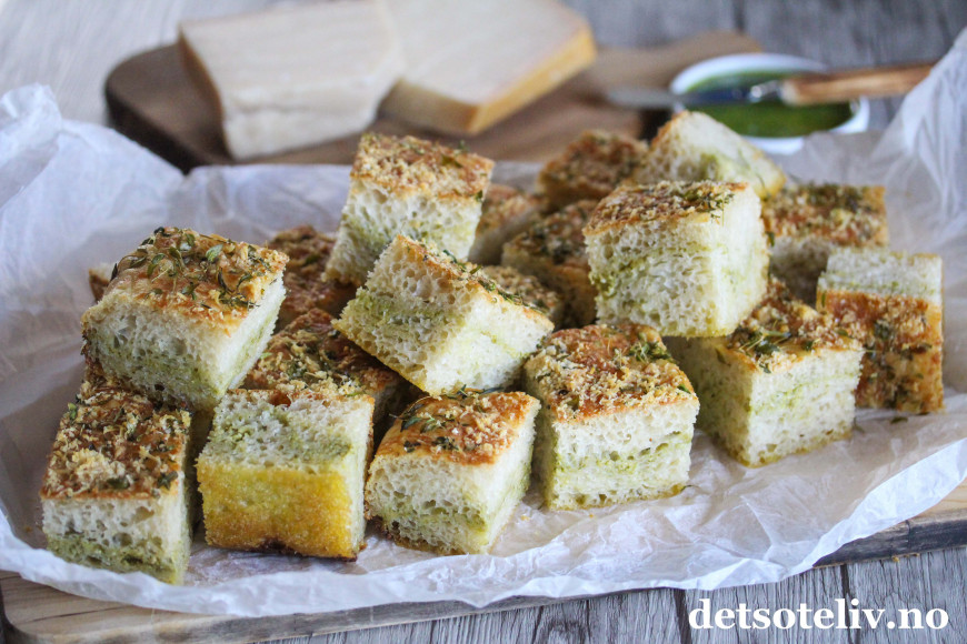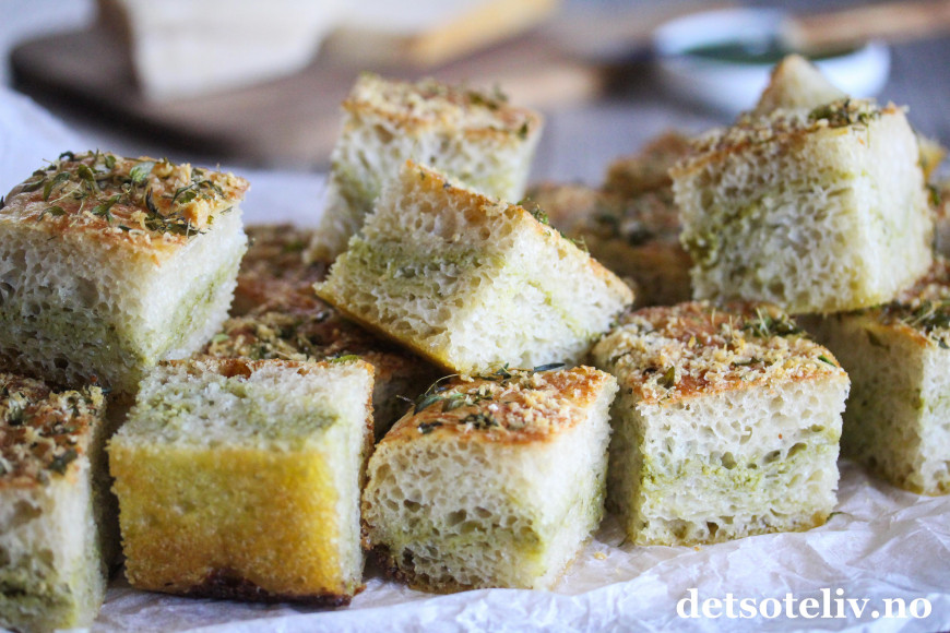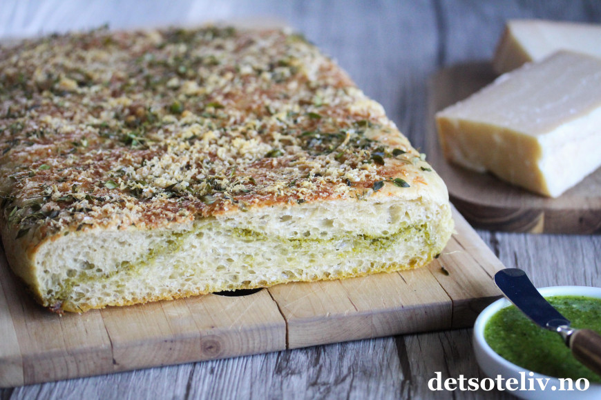 Server focacciaen gjerne med ekstra pesto og parmesan ved siden av.