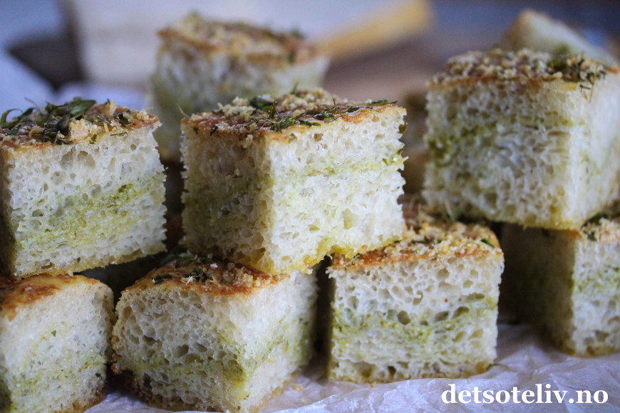 Focaccia finnes i flere varianter her på Det søte liv og er kjempegodt egnet som tilbehør til grillmat eller koldtbord. Personlig favoritt er å fylle focaccia med ost og masse tomater og spise det til lunsj eller som kveldsmat. Eller å servere med ekstra pesto og god parmesanost ved siden av.