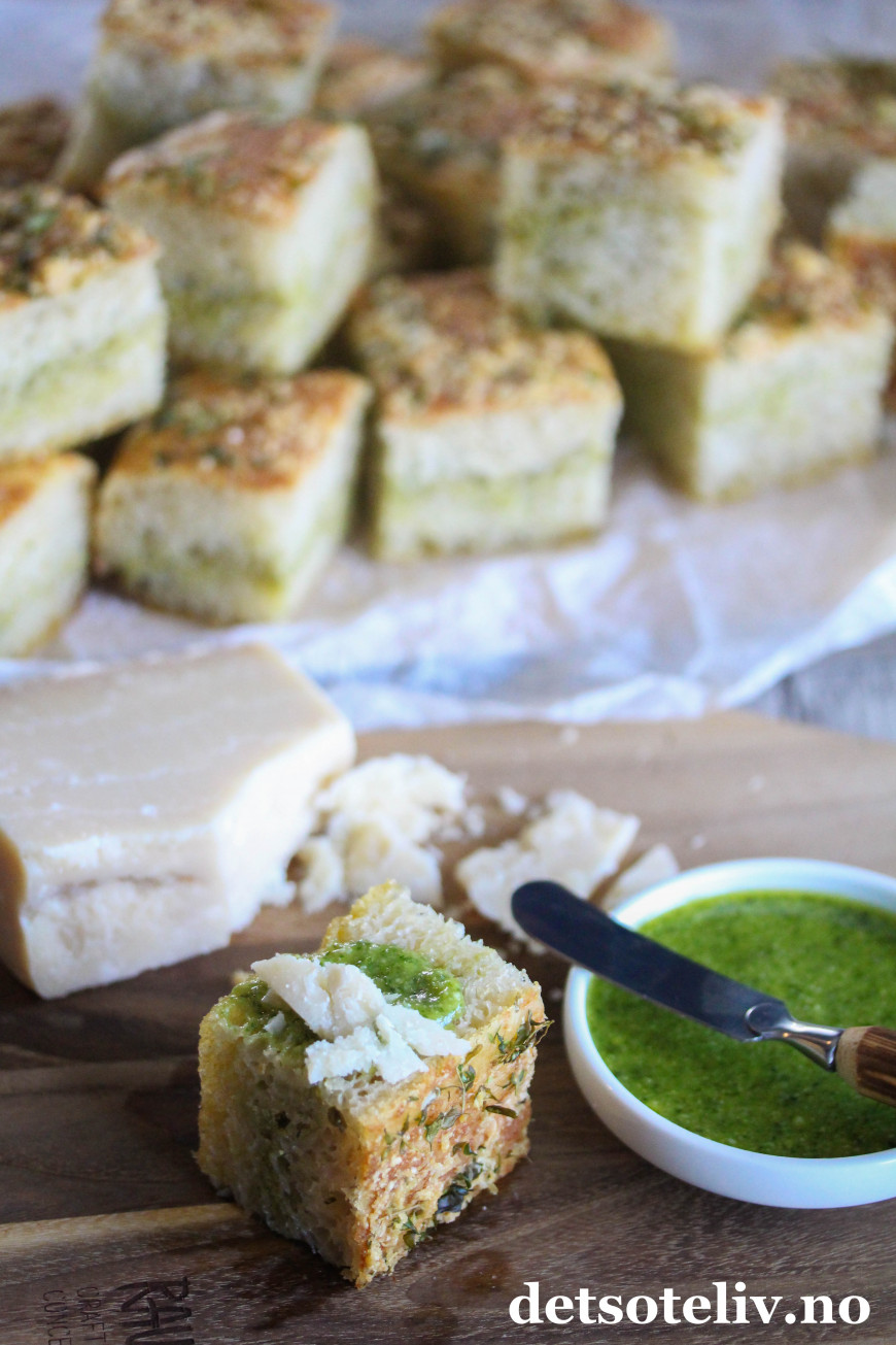 Her kommer en kjempegod oppskrift på focaccia som jeg har fylt med hjemmelaget pesto og ekstra mye parmesan.