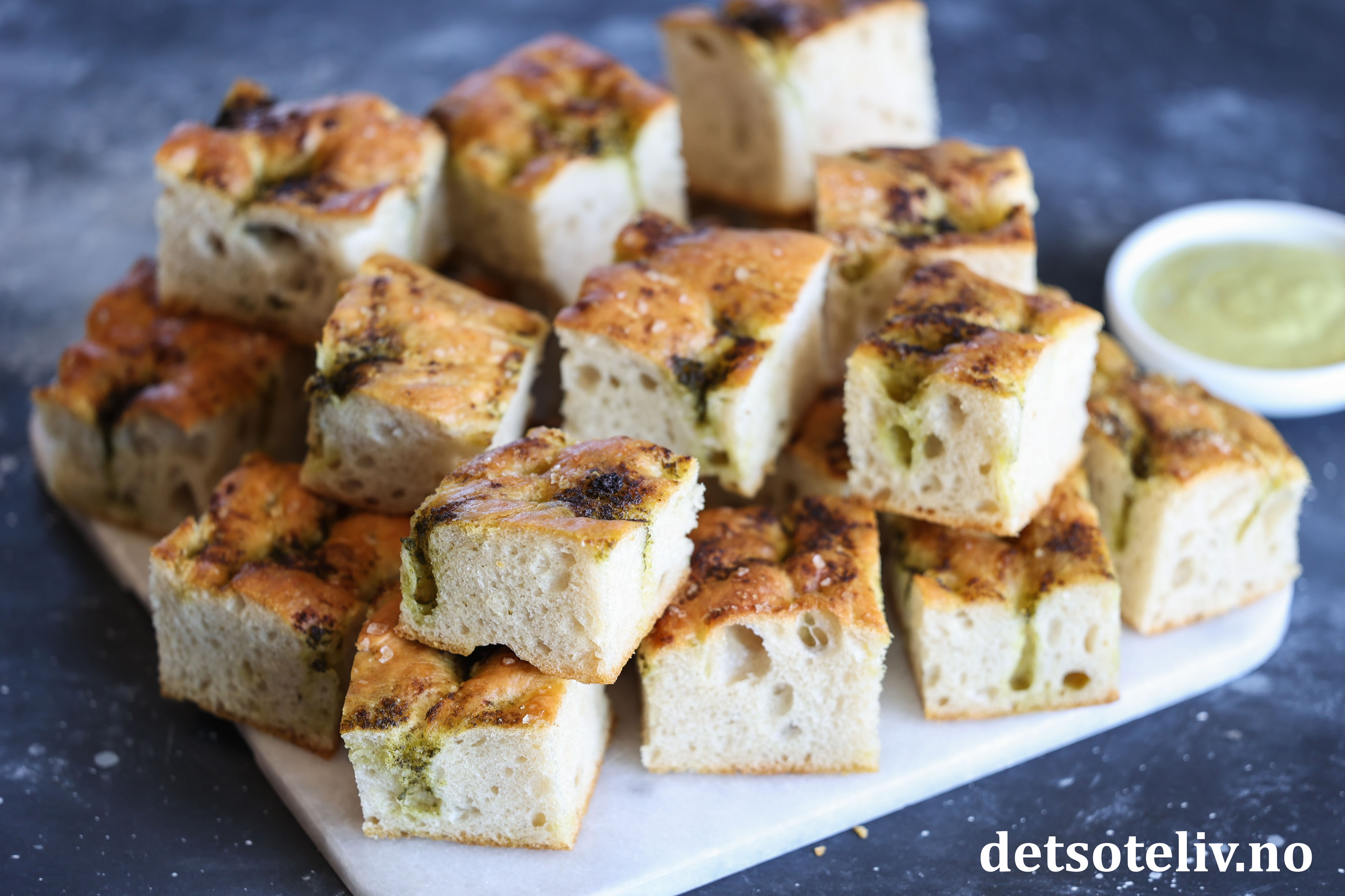 ♥ Focaccia kan fryses. Ved tining kan du varme opp bitene litt i ovnen, så smaker de som nystekte igjen.