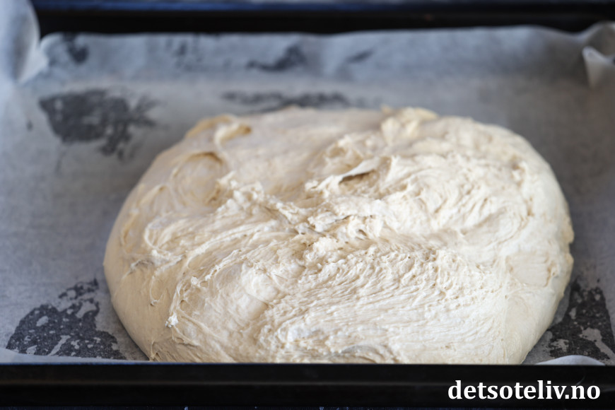 Dekk en stor langpanne (ca. 30 x 40 cm) med bakepapir. Hell den hevede deigen rett over i langpannen.