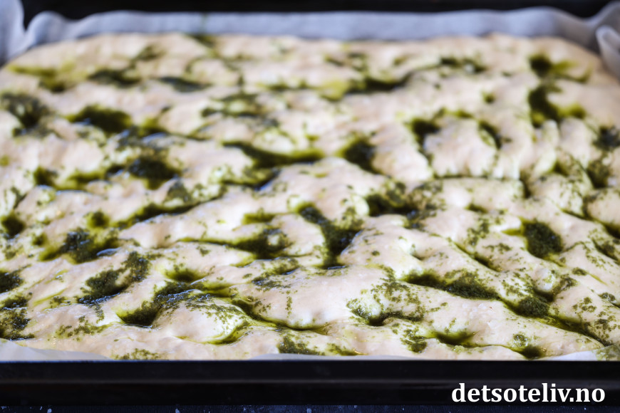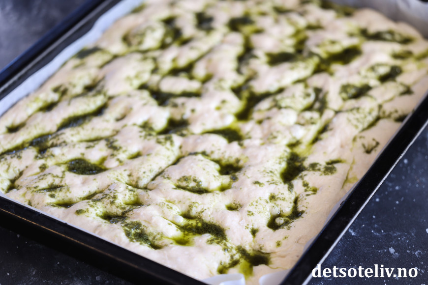 Dekk en stor langpanne (ca. 30 x 40 cm) med bakepapir. Hell den hevede deigen rett over i langpannen. Ha litt olivenolje på fingrene, og press deigen utover i langpannen i et jevnt lag (se tips).