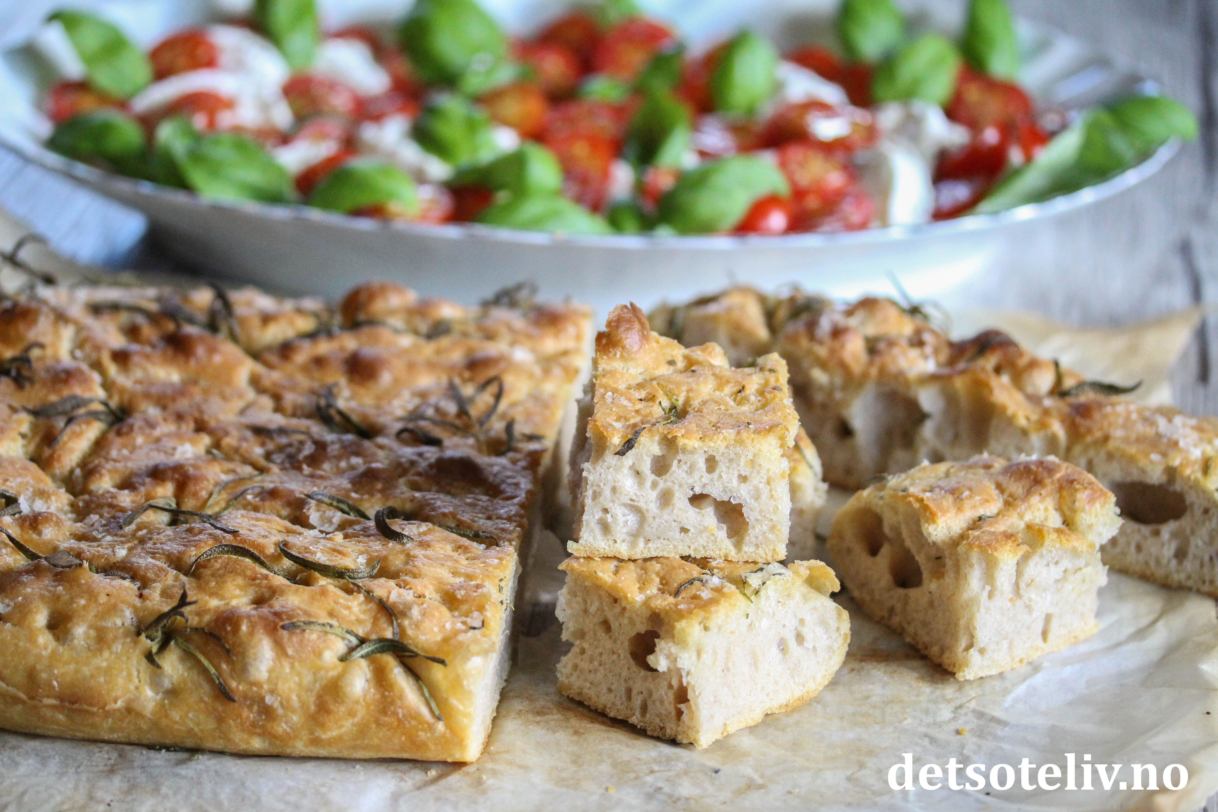 ♥ Focaccia smaker aller best nystekt. Får du rester, kan de gjerne legges i fryseren. Ellers går det også an å oppbevare biter av focaccia i noen dager innpakket i plast.