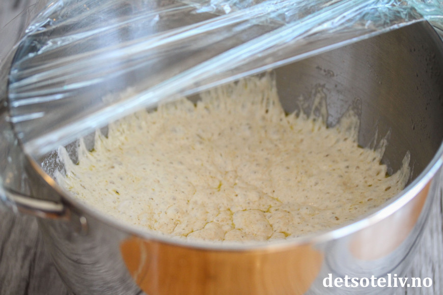 La deigen stå og heve i romtemperatur i 12 – 18 timer. Hvis du eksempelvis rører sammen deigen kl. 22 på kvelden, er deigen klar til å stekes kl 16 dagen etter.