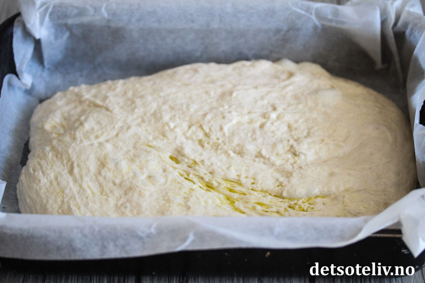 Utgangspunktet er min favorittoppskrift på Eltefri focaccia, som er beregnet til liten langpanne.