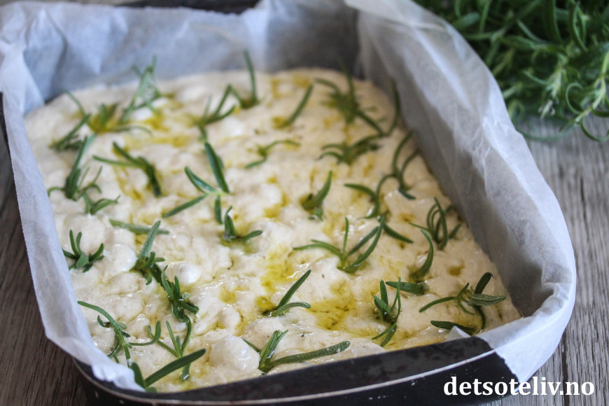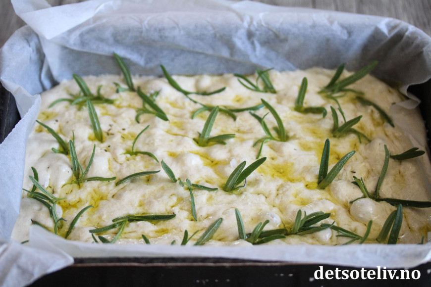 Ha godt med olivenolje på fingrene slik at deigen ikke klisser og trykk deigen jevnt utover i langpannen. Lag deretter dype groper i deigen med fingrene. Fordel over litt mer olivenolje og dryss over maldonsalt. Knip små kvaster av rosmarinen og stikk dem ned i deigen.