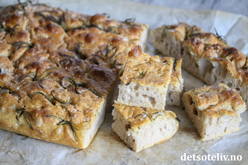 Stek focacciaen midt i ovnen ved 225°C i ca. 30 minutter, til den er gyllen og gjennomstekt. Avkjøl på rist og skjær opp i biter før servering.