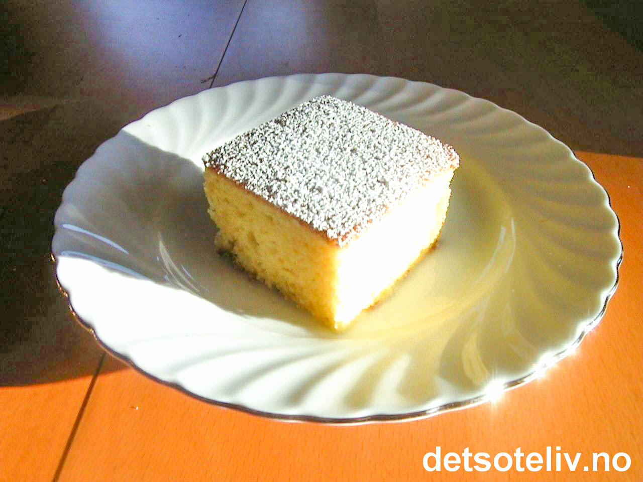 Ha deigen i en stor, bakepapirkledd langpanne (ca 30x40 cm). Stek kaken midt i ovnen ved 200°C i 25-30 min. Avkjøl kaken i formen. Hvelv kaken forsiktig ut av formen og fjern bakepapiret. Del kaken i passe store firkanter og sikt over litt melis før servering.