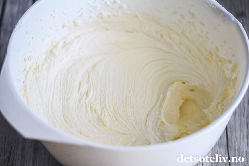 Pisk mykt, romtemperert smør luftig sammen med vaniljesukker, melis og melk.