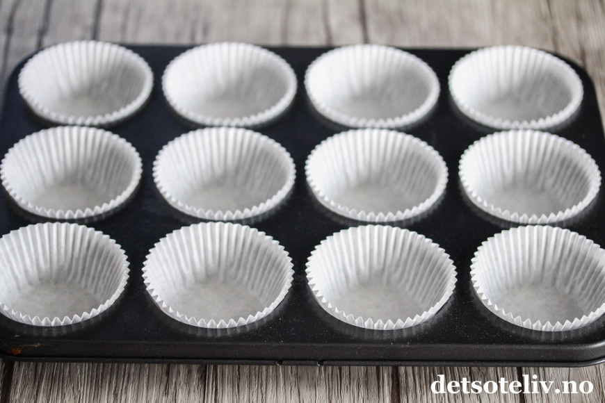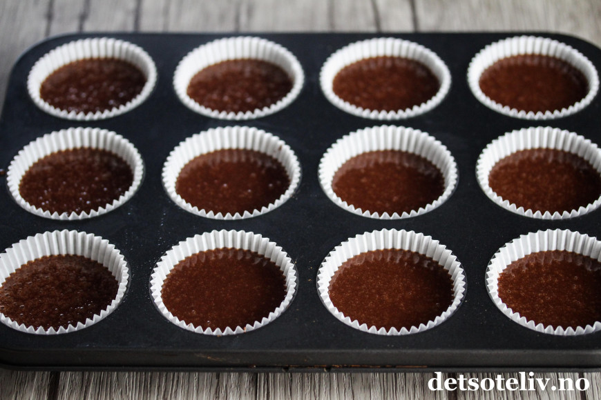 Sett hvite papirformer i muffinsbrett. Fyll formene 2/3 fulle med kakerøre.