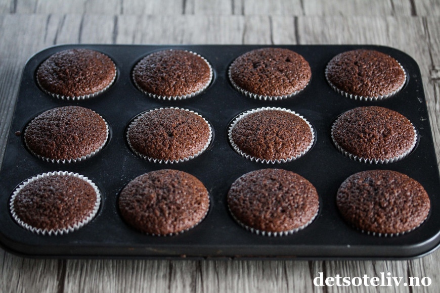 Stek muffinsene midt i ovnen ved 160°C i ca 25 minutter (sjekk med kakenål at muffinsene er helt gjennomstekte før du tar dem ut av ovnen). Avkjøl muffinsene til de er helt kalde.