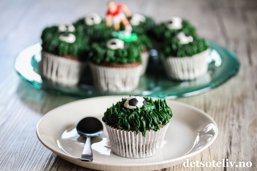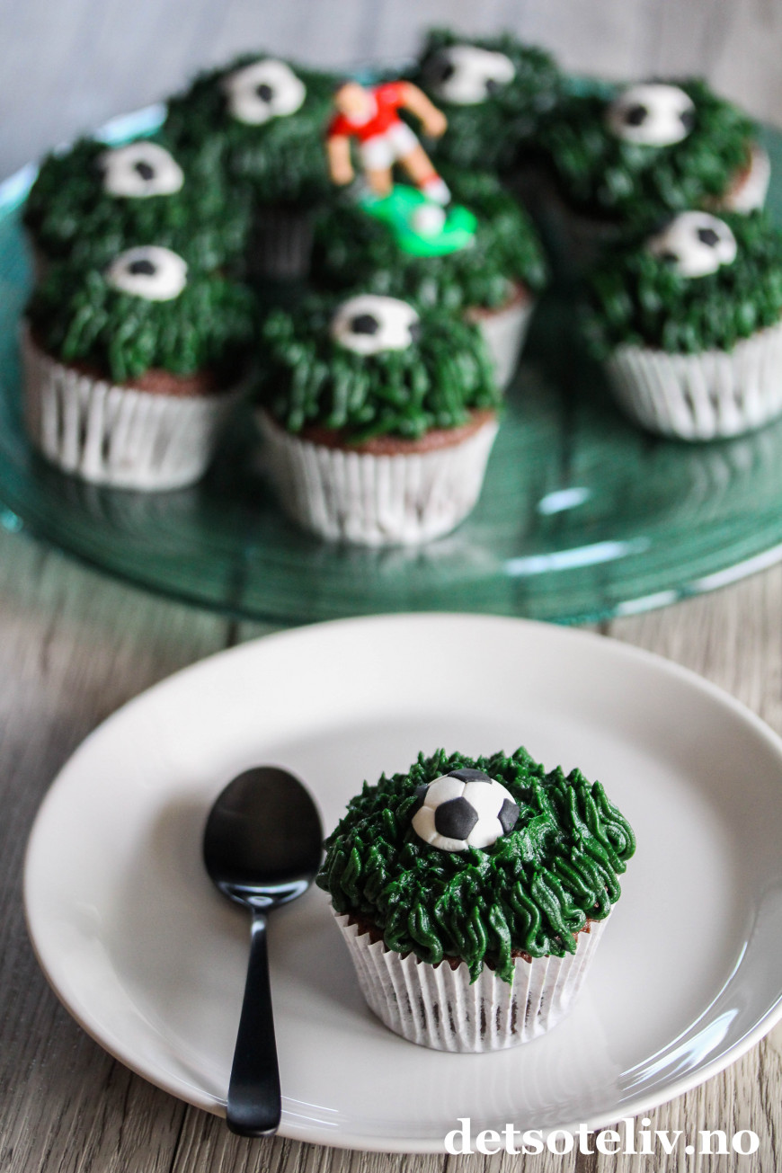 Dette er myke sjokolademuffins og deilig vaniljefrosting som er farget grønn. Fotballene og det du trenger av sprøyteutstyr for å forme kremen til gress finner du i den supre nettbutikken til Slikkepott.no.