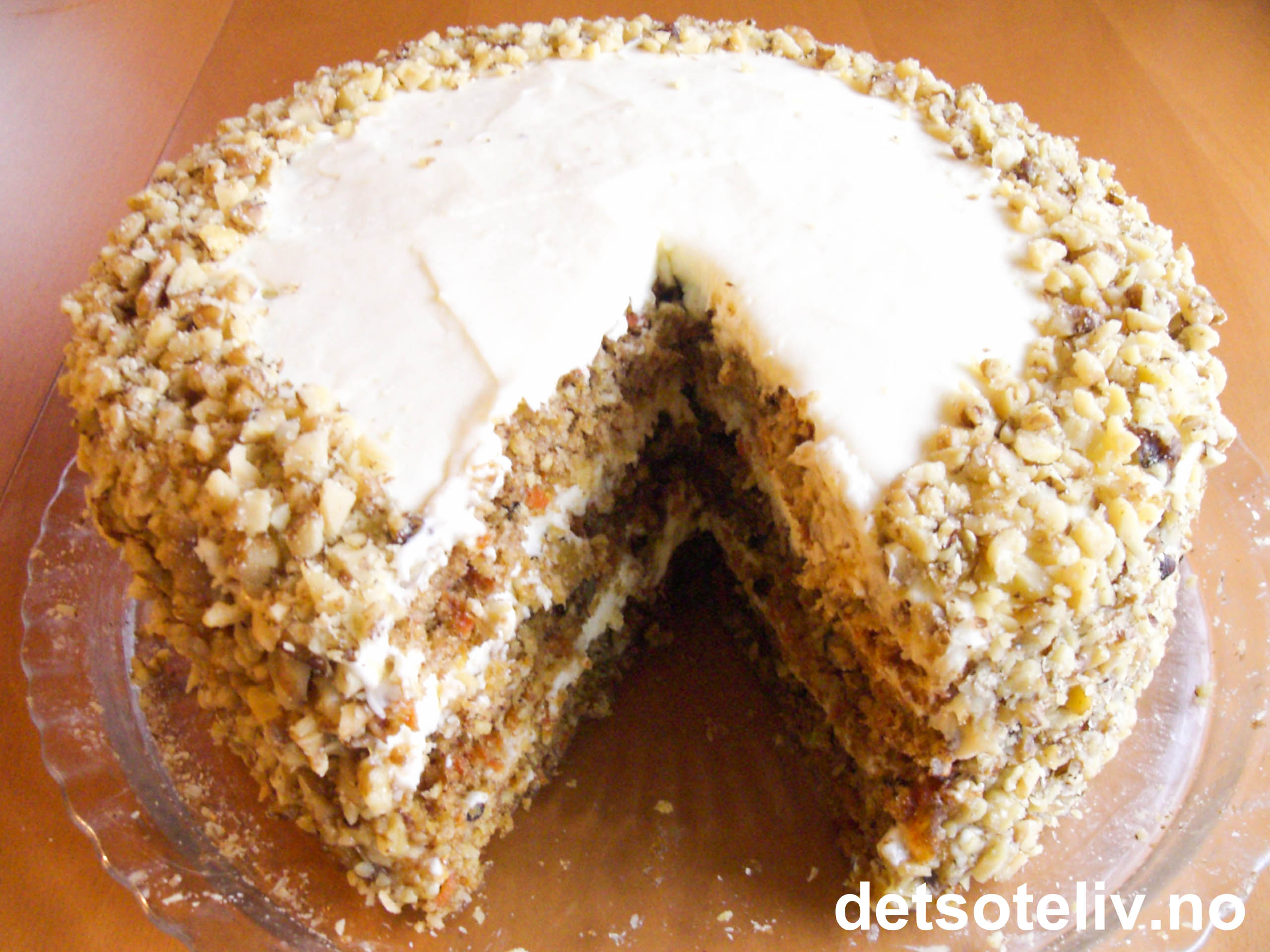 Pisk sammen eggene med en stålvisp i en bakebolle. Bland inn oljen og sukkeret. Bland sammen alle de tørre ingrediensene i en annen bakebolle. Bland så det tørre inn i eggeblandingen og rør til du får en jevn deig. Bland deretter inn kokos, hakkede valnøtter, most ananas og til slutt finrevet gulrot.