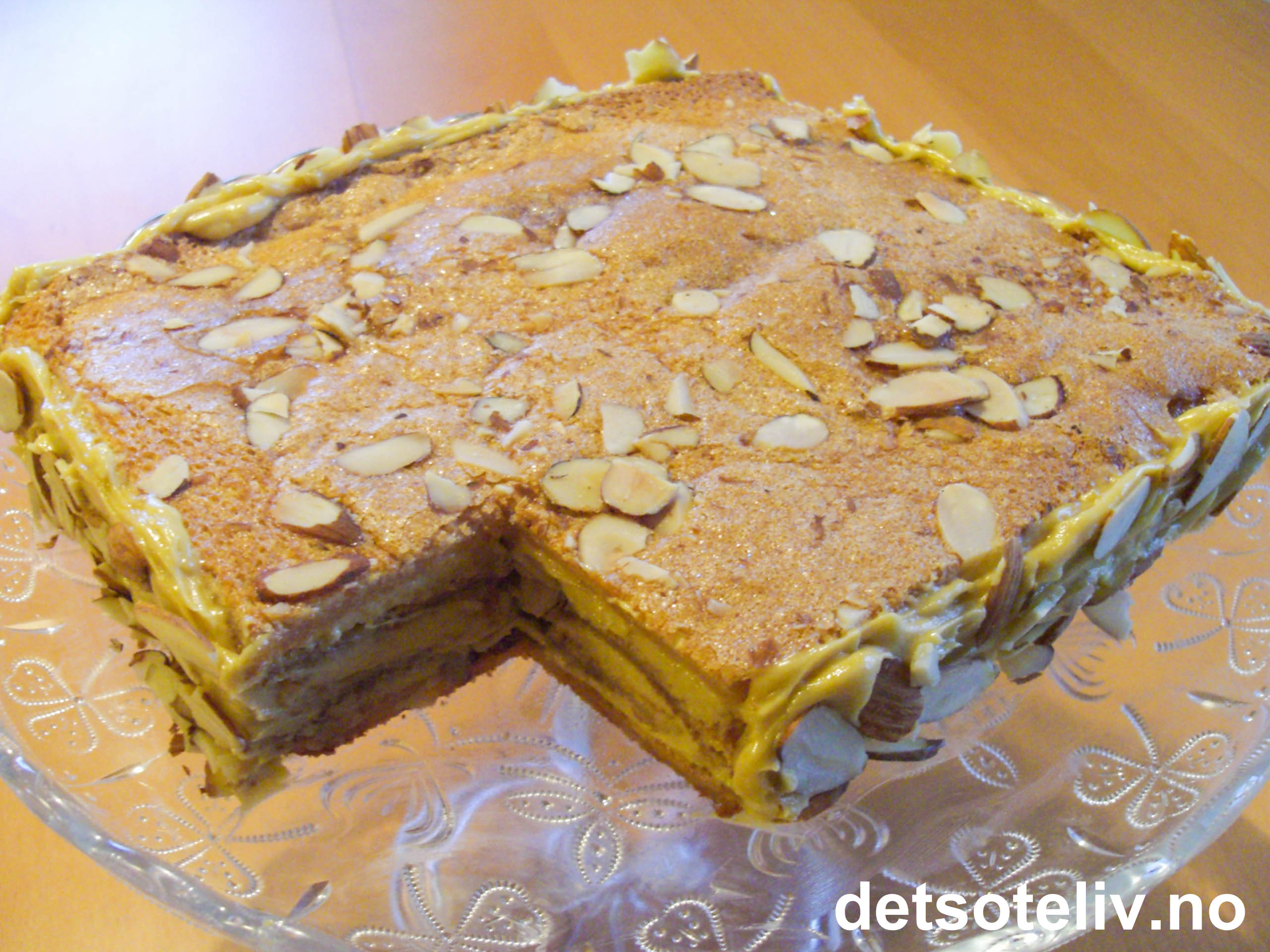 Dekk en stekeplate med bakepapir. Smør deigen jevnt utover platen. Dryss over sukkeret og halvparten av mandelflarnene. Stek bunnen midt i ovnen ved 160°C i 40-50 min, til den er gylden. Avkjøl bunnen på platen til den er helt kald.