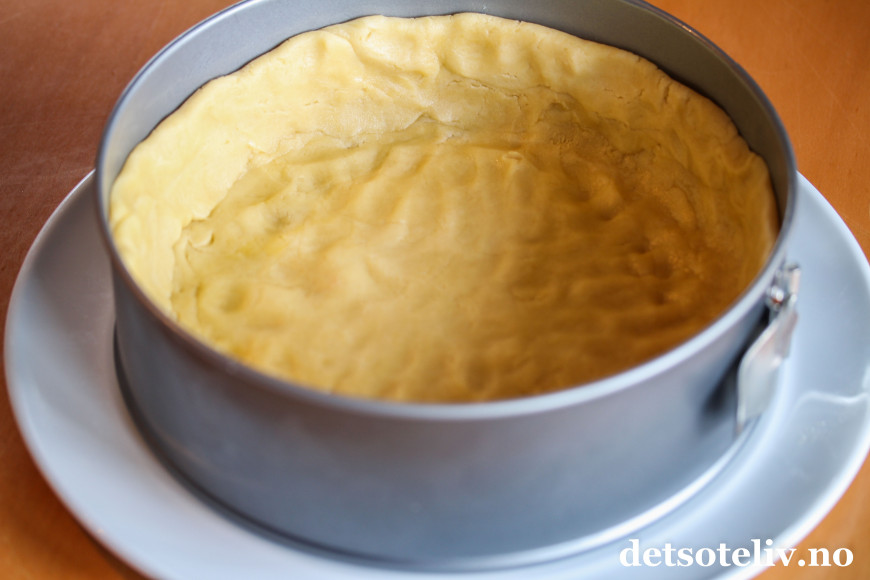 Kjevle deigen forsiktig ut på bakebordet som er drysset med melis (ikke bruk mel til utbakingen), og kle bunnen og 3-5 cm av kanten av kakeformen med deig.