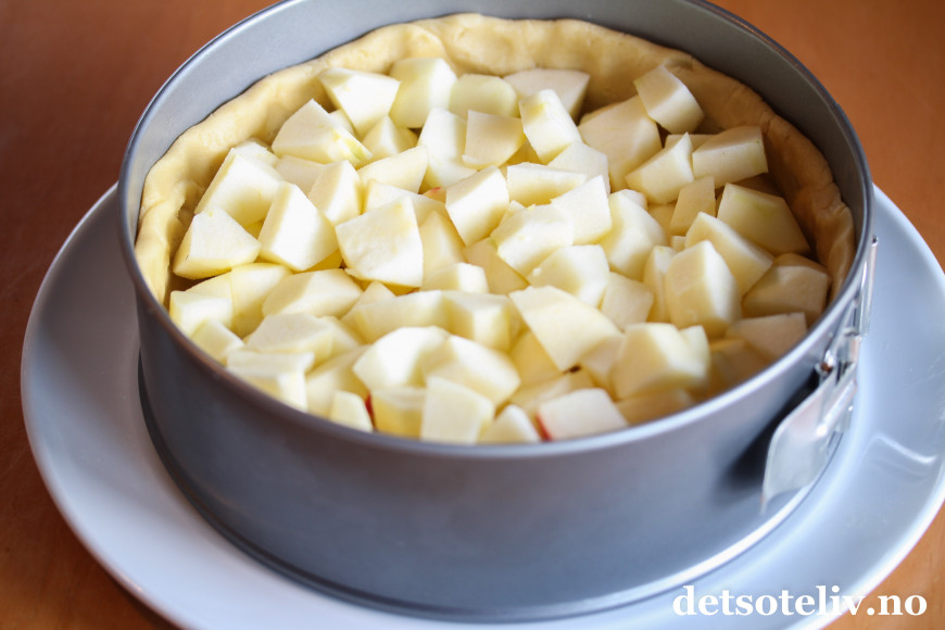 Del eplene i terninger (du bestemmer selv om du vil skrelle eplebitene eller ikke - jeg skrelte dem) og legg eplebitene i formen så de kommer helt opp til kanten av deigen.