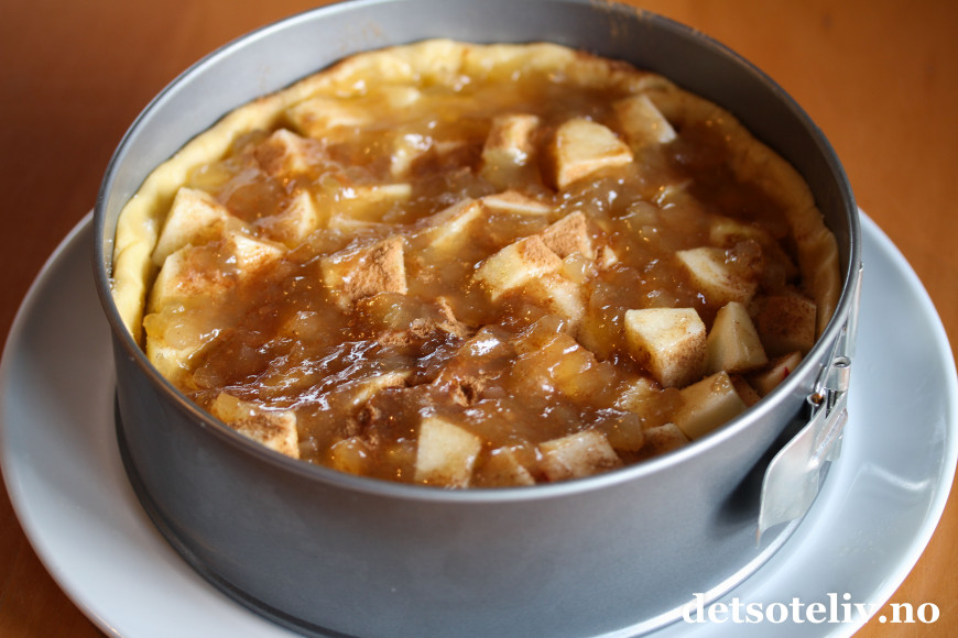 ♥ Jeg brukte all mørdeig til bunnen og kantene, men skulle du få litt mørdeig til overs etter å ha kledd formen, kan du kjevle ut deigrestene og legge tynne strimler oppå eplesyltetøyet før steking av kaken. Det trenger ikke se så pent ut, for kaken skal jo uansett dekkes med krem og marsipan senere.