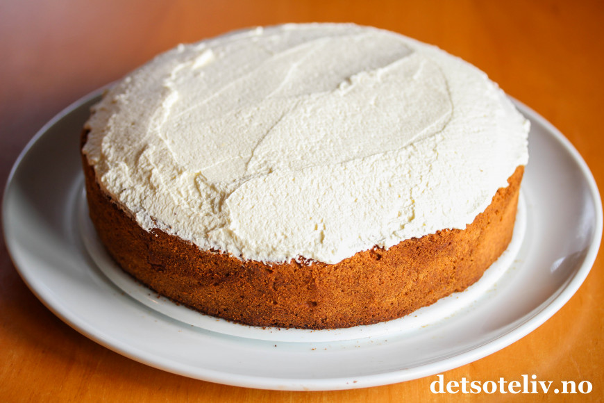 Pisk kremfløten og sukkeret til tykk, luftig fløtekrem. Hold av litt krem til pynt og smør resten av kremen utover kaken.