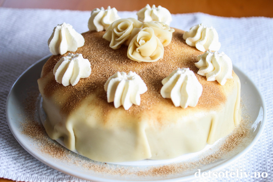 Dryss kanelsukker over marsipanlokket og pynt med sprøytet krem og marsipanroser.
