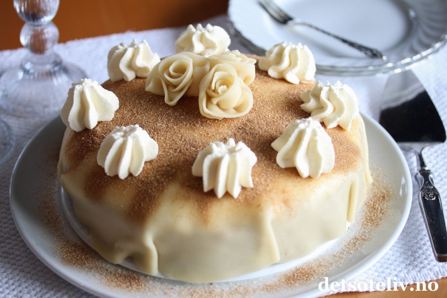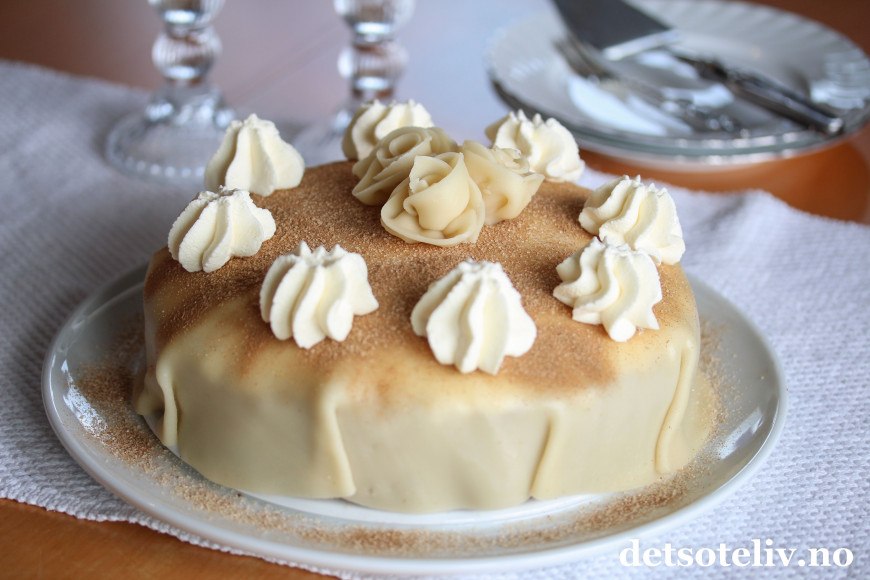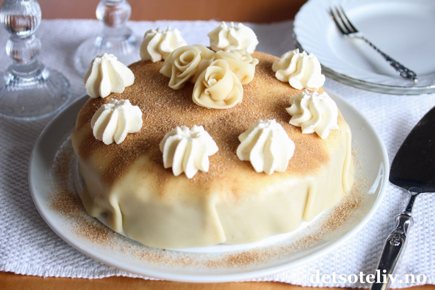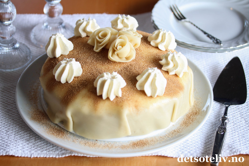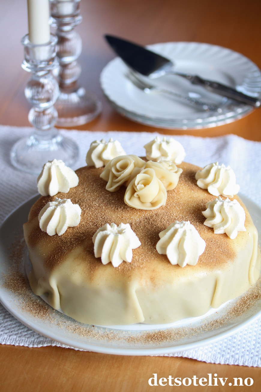 ♥ Hvis du vil lage kaken flere dager før servering, kan du fint fryse den stekte kaken. Ta den da ut av fryseren kvelden før serveringsdagen og la kaken tine på kakefatet i kjøleskapet over natten. Dagen etter kan du pynte kaken med krem og marsipan.
