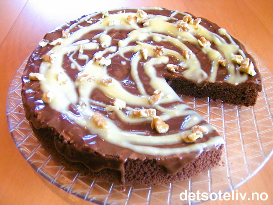 Smelt smør og kokesjokolade i en liten kjele på svak varme (eller i en kopp i mikro). Smør den mørke sjokoladeglasuren over den kalde kaken. Smelt deretter den hvite sjokoladen sammen med 25 g smør. Ringle den smeltede hvite sjokoladen over kaken med en teskje. Dryss over noen grovt hakkede valnøtter. Sett kaken kaldt til glasuren har stivnet.