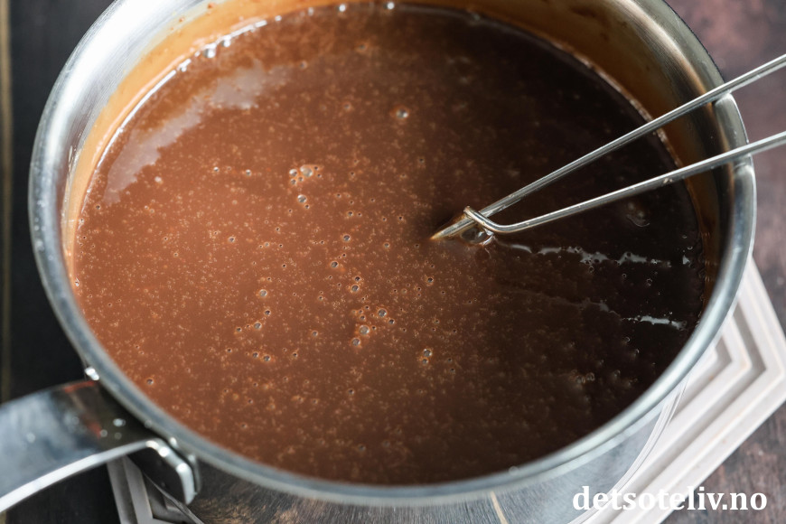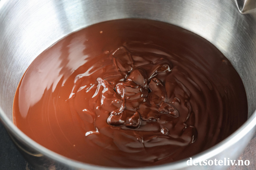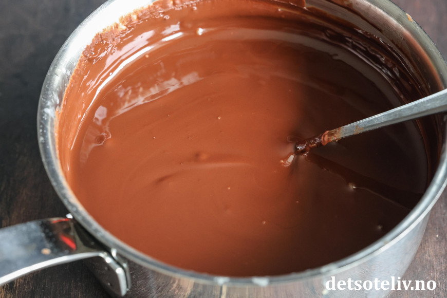Smelt smøret i en kjele. Ta kjele av platen og tilsett oppdelt kokesjokolade. La sjokoladen smelte i det varme smøret og rør blandingen jevn.