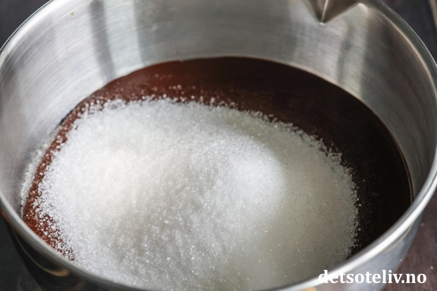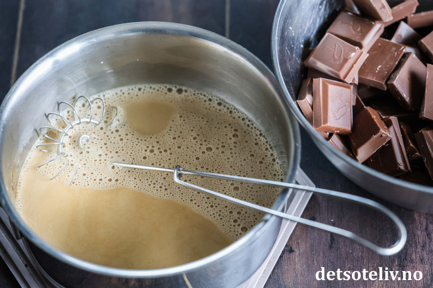 Ta kjelen av platen og tilsett oppdelt melkesjokolade og melis.