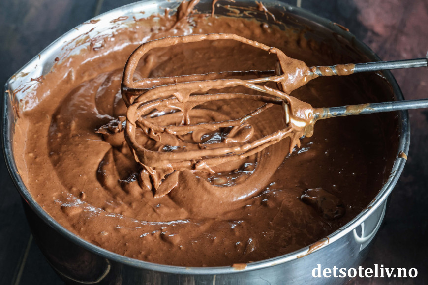 ♥ Det er litt omstendelig å piske inn ett egg om gangen, men det er lurt for at eggene gradvis skal tas opp i sjokoladedeigen uten at den skiller seg.