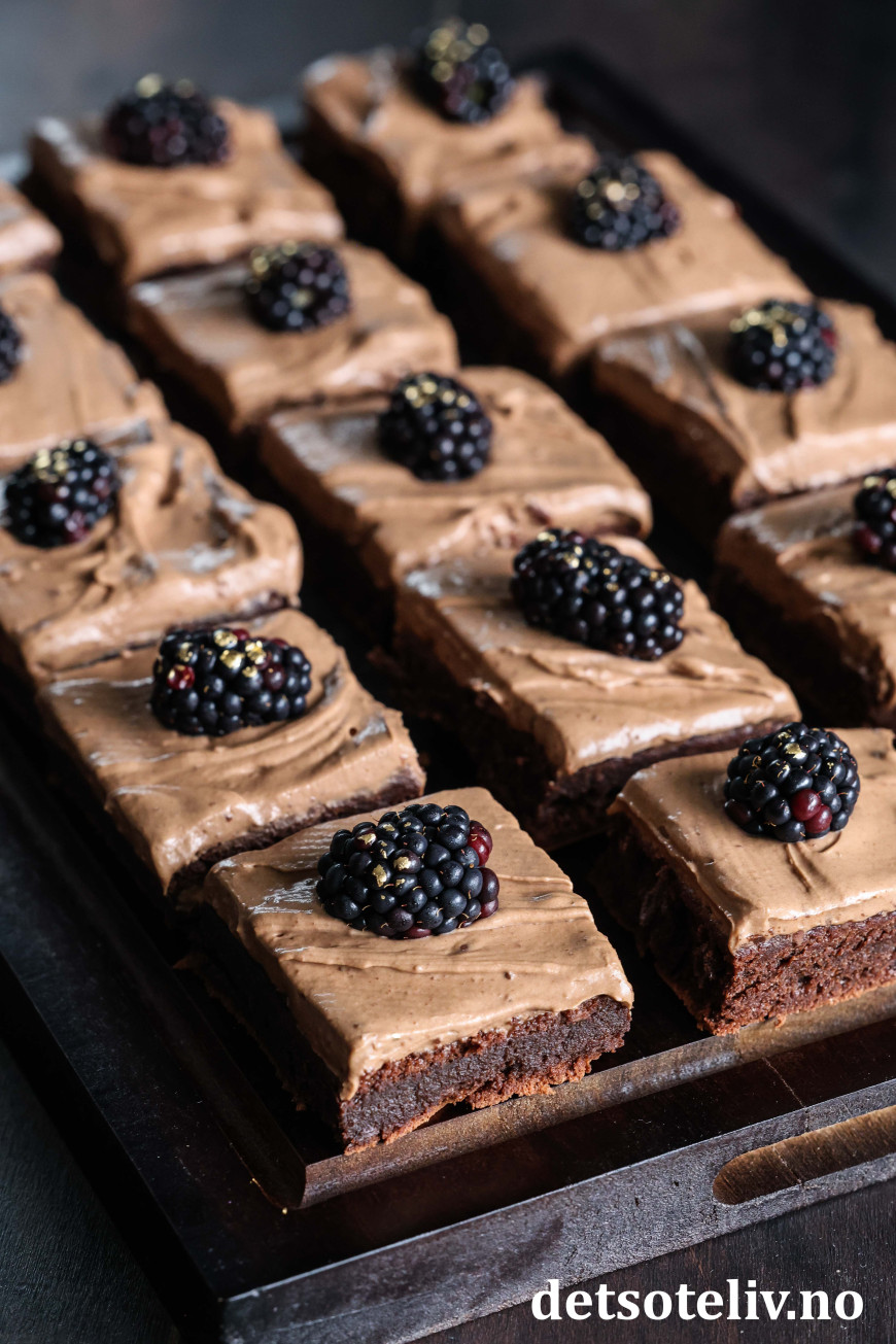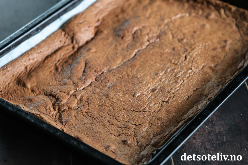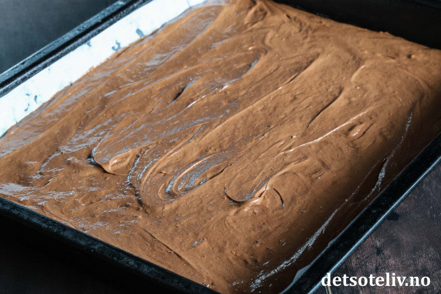 Hell sjokoladedeigen i en stor, bakepapirkledd langpanne (ca. 30 x 40 cm).