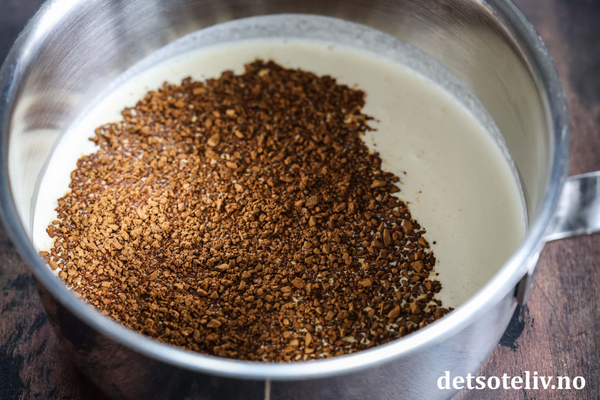 Ha kremfløte og kaffepulver i en kjele. Varm opp blandingen og visp til kaffepulveret har løst seg opp. Ta kjelen av platen og tilsett oppdelt melkesjokolade og melis.