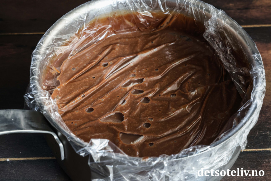 Dekk til kjelen med plastfolie og sett den i kjøleskapet til sjokoladefløten er helt kald, gjerne over natten (se tips).