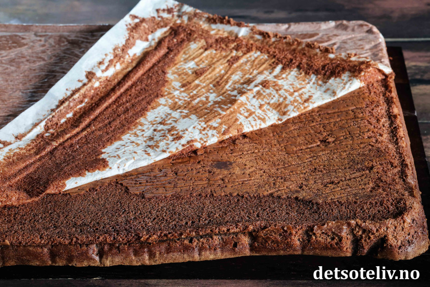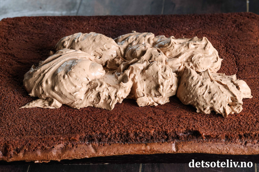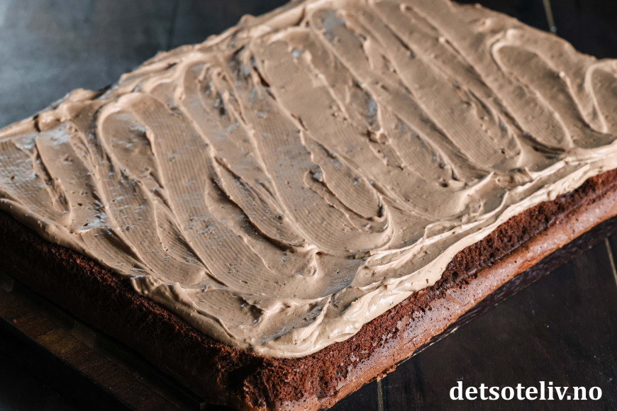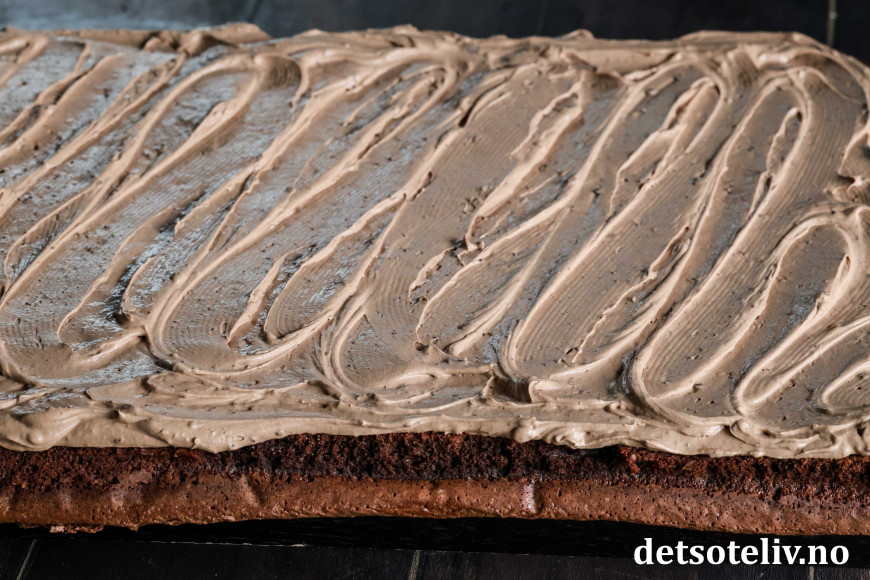 Hvelv kaken ut av langpannen og dra av bakepapiret. Fordel sjokoladekremen over kaken i et jevnt lag.