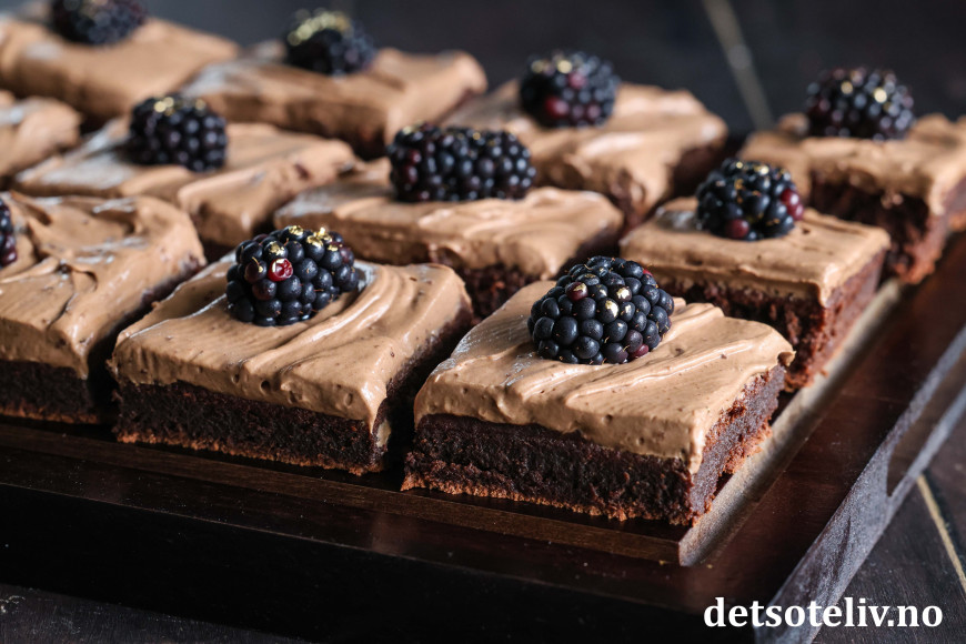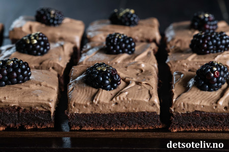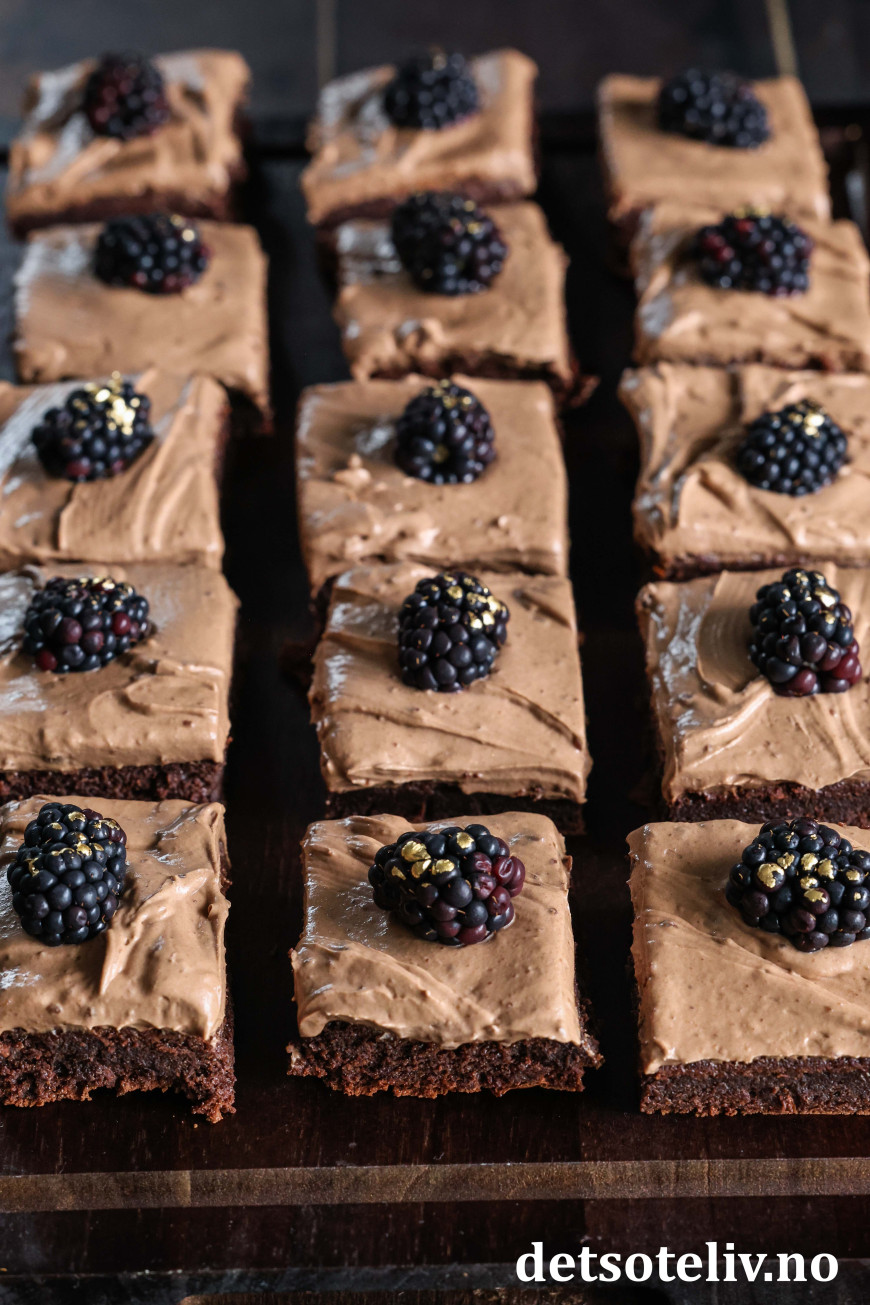 Del kaken i firkanter. Pynt hvert kakestykke etter ønske, for eksempel med bjørnebær som er pyntet med litt spiselig gullflak.
