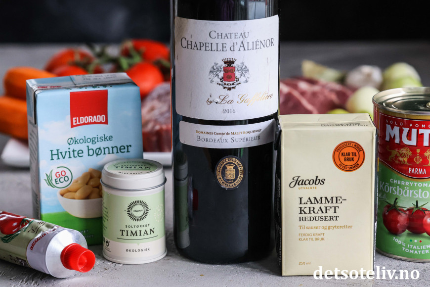Skrell gulrøttene, skjær dem i tykke skiver og ha i gryten. Skjær tomatene i båter og ha i gryten. Tilsett også tomatpuré, laurbærblad og tørket timian. Hell så i rødvin, lammekraft, vann og hermetiske cherrytomater (jeg bruker vannet til å steke ut stekepannen og skylle tomatboksen). Bland alt godt sammen.