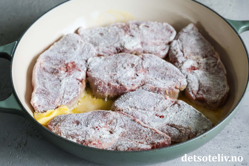 Ha hvetemel på en tallerken. Kvern over salt og pepper og bland dette med melet. Vend deretter lammekotelettene i hvetemelet slik at de blir godt dekket på begge sider.