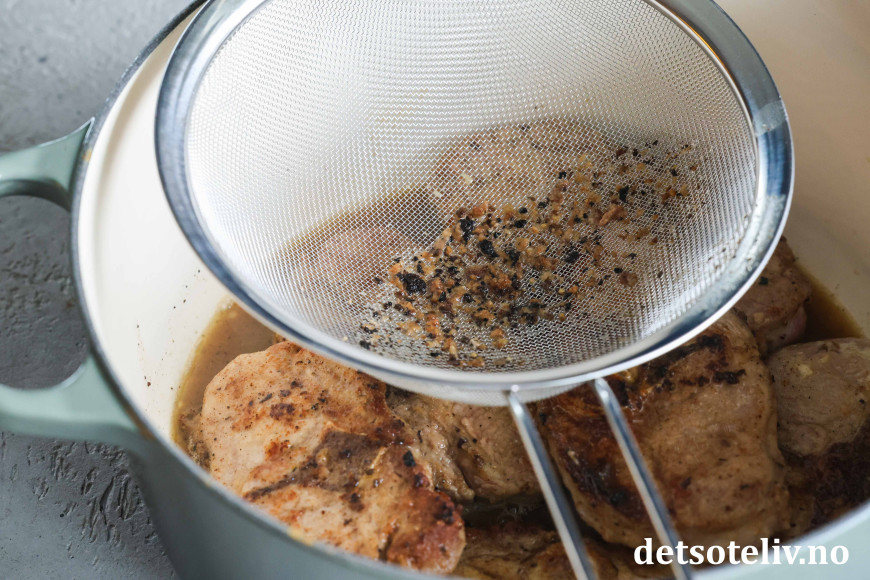 Vask ut pannen med litt vann slik at du får med den gode stekesjyen i gryten (sil den eventuelt dersom den er grumsete).