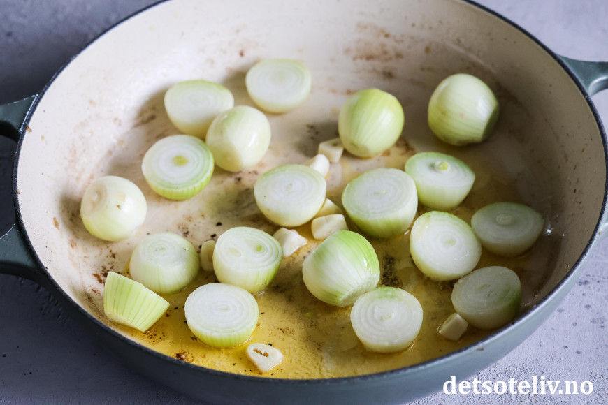 Smelt nye 2 ss smør i den samme stekepannen og tilsett småløk (del dem på midten hvis de er store) og hakkede hvitløksfedd. Stek løken på middels varme i et par minutter til løken er gyllen. Ha løken over i gryten og få også denne gangen med deg stekesjyen.