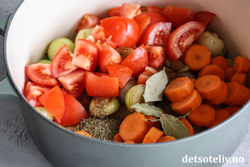 Skrell gulrøttene, skjær dem i tykke skiver og ha i gryten. Skjær tomatene i båter og ha i gryten. Tilsett også tomatpuré, laurbærblad og tørket timian.