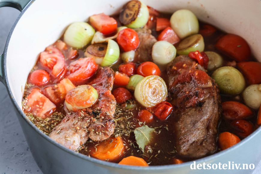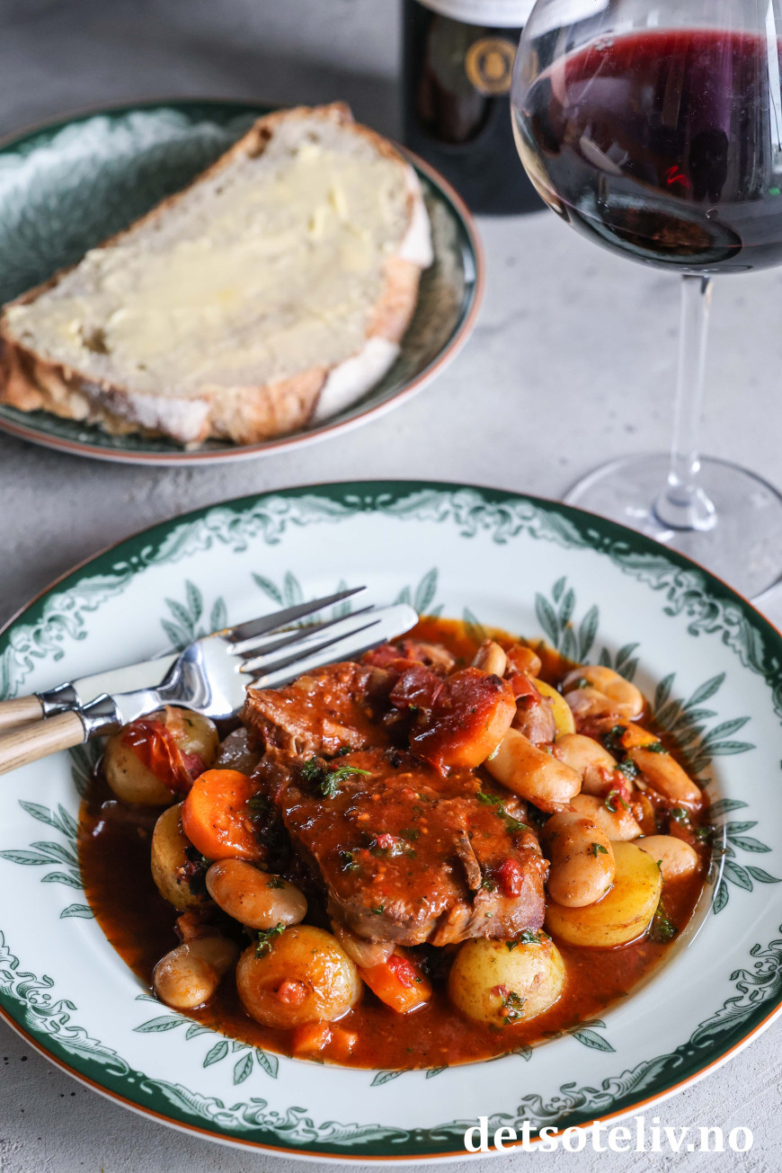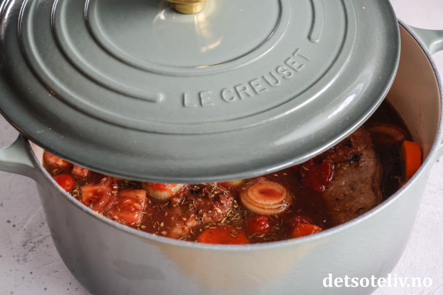 ♥ Du trenger ikke å være bekymret for alkoholen fra rødvinen i gryten, for den forsvinner gjennom den lange kokingen, så det er ikke problem å servere maten til barn.