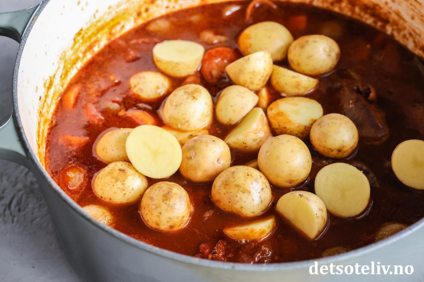 Tilsett småpoteter og la gryten småkoke i ca. 30 minutter til (om du beholder lokket på nå, avhenger av hvor tykk du ønsker at lammegryten skal være).