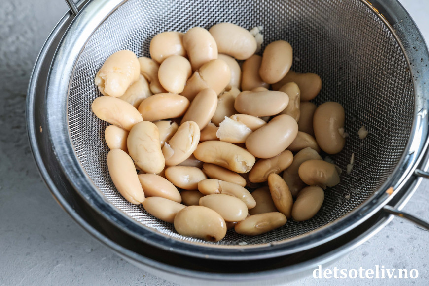 Skyll de hvite bønnene under kaldt vann og ha i gryten helt på slutten av koketiden. Bønnene bør ikke småkoke i mer enn ca. 5 minutter.
