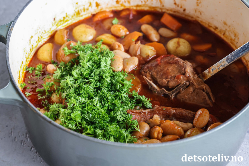 Skyll de hvite bønnene under kaldt vann og ha i gryten helt på slutten av koketiden.