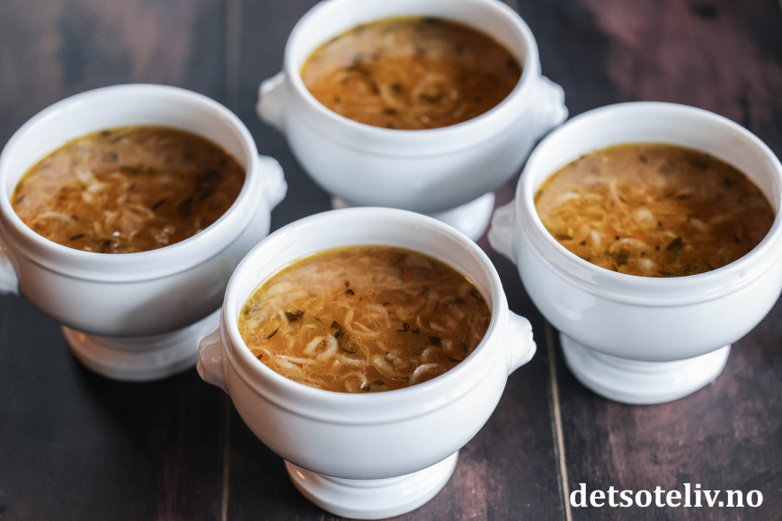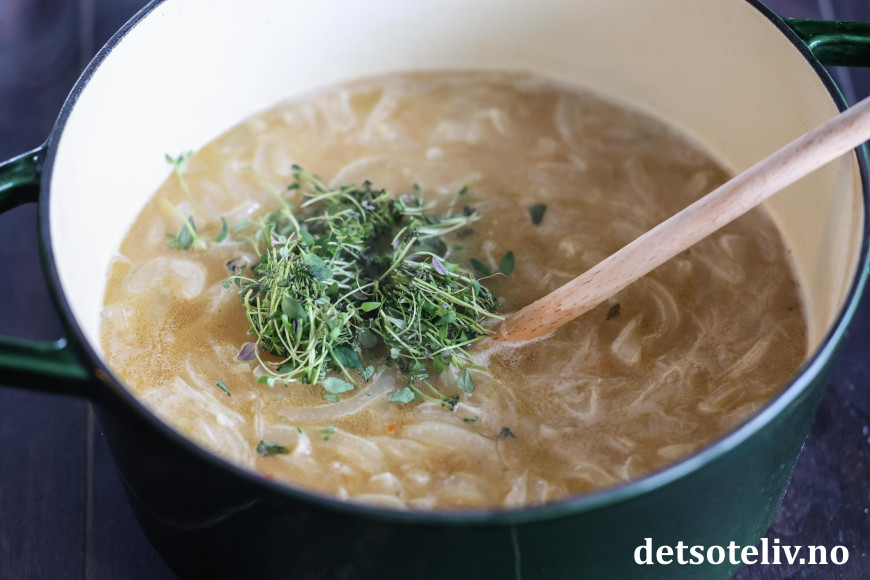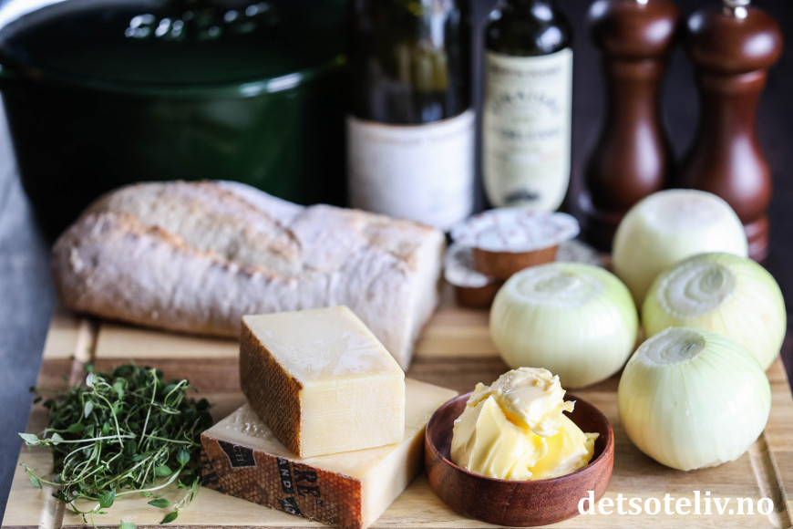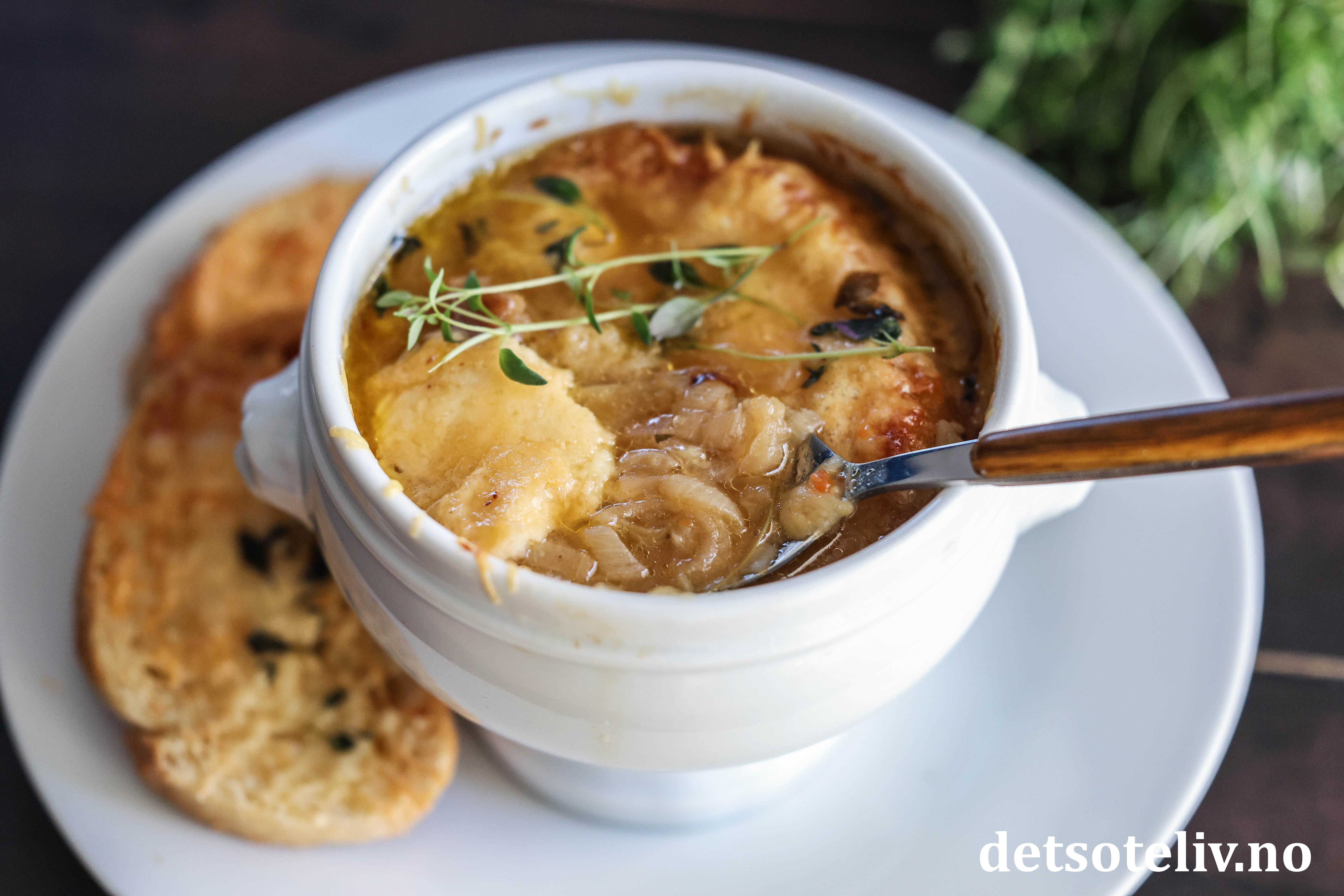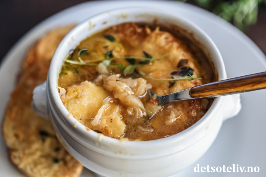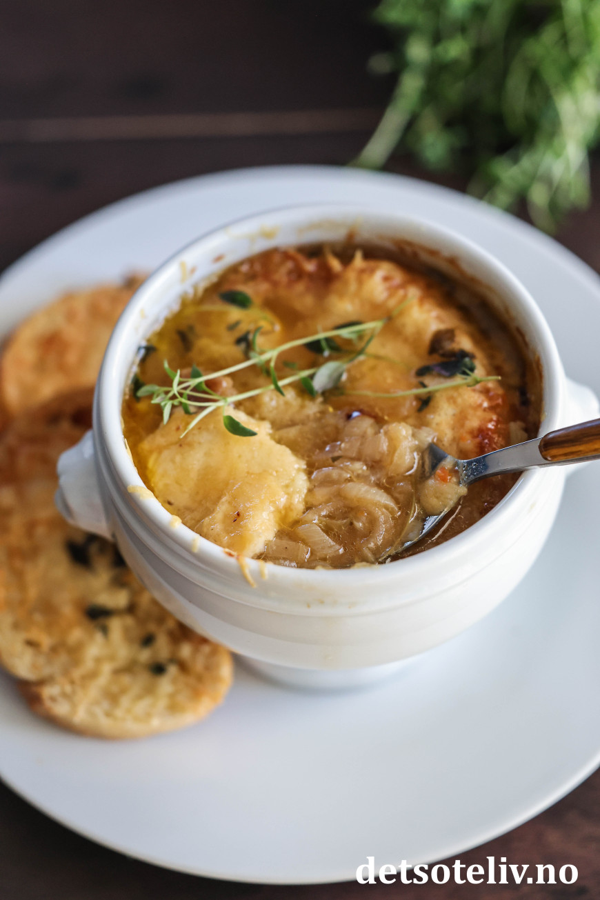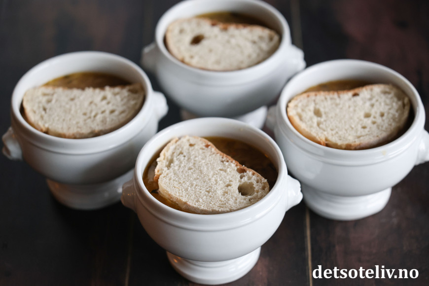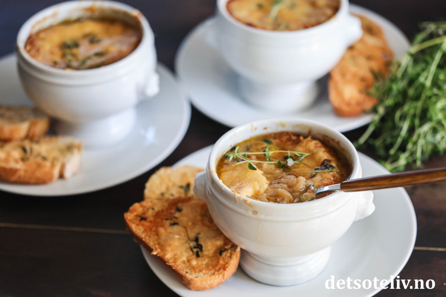 Server løksuppen rykende varm (husk å advare dine gjester om at suppeskålene er varme så de ikke brenner seg på fingrene 😊 ).