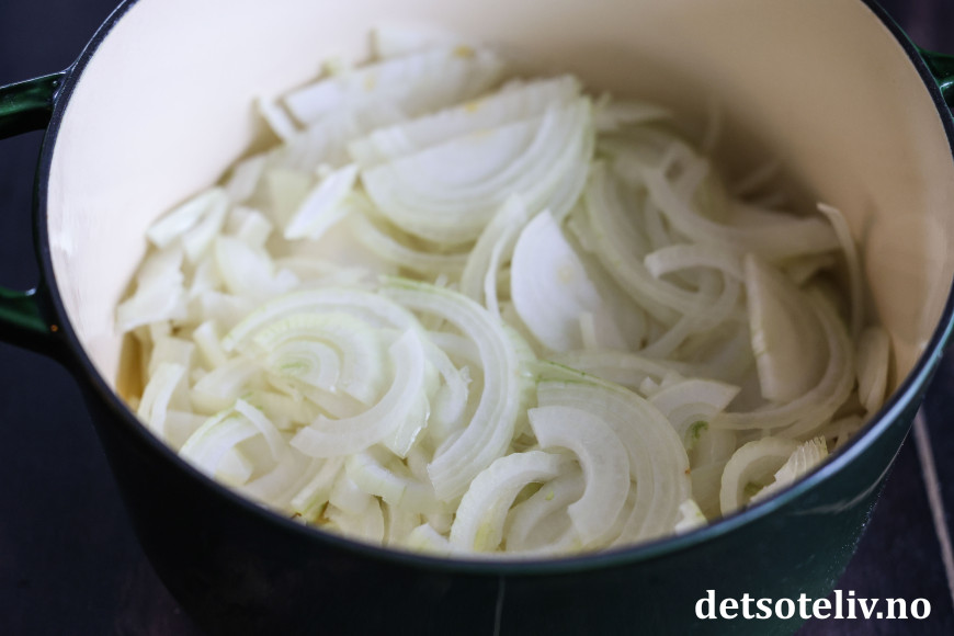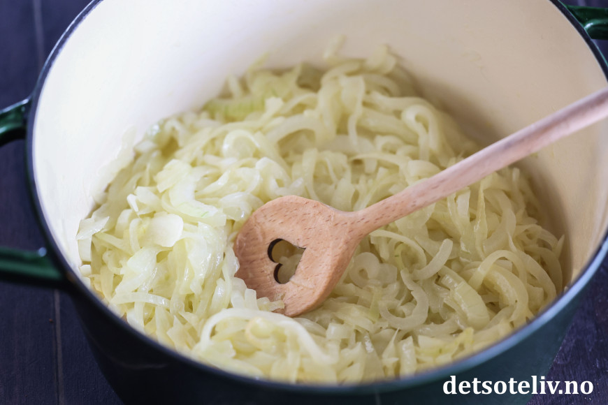 Skrell løk og skjær dem først over på midten og deretter i tynne skiver. Smelt smøret i en gryte og tilsett løkskivene.