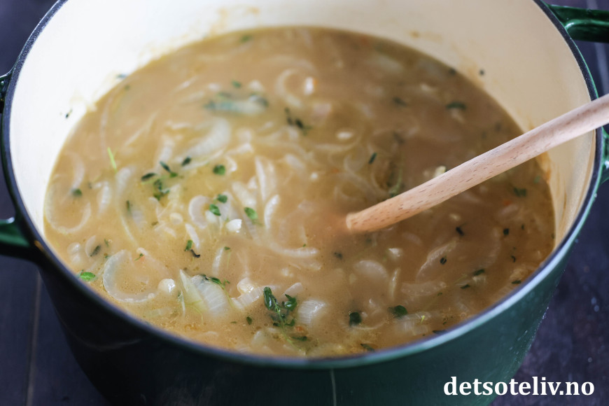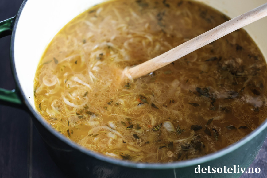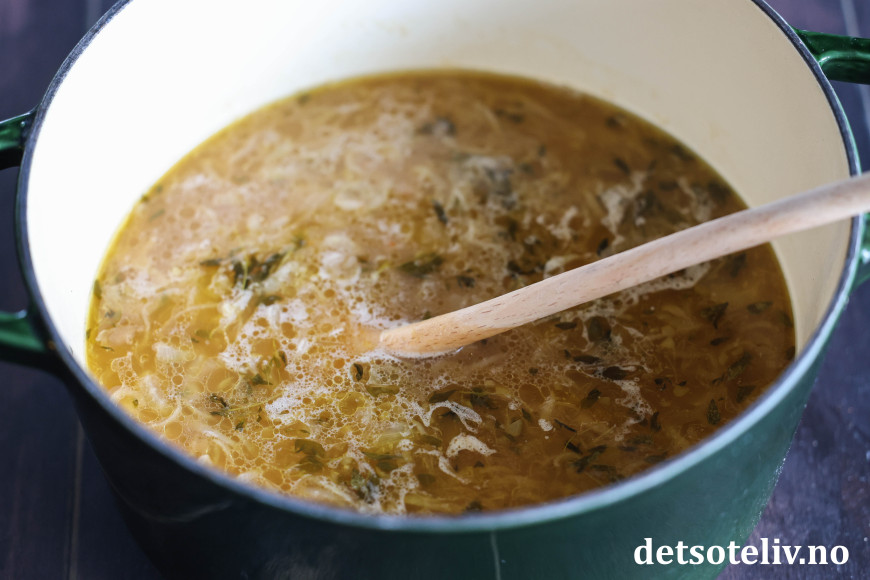 Sett på lokk og gi suppen et oppkok. Senk varmen og la suppen småkoke under lokk i ca. 45 - 55 minutter.