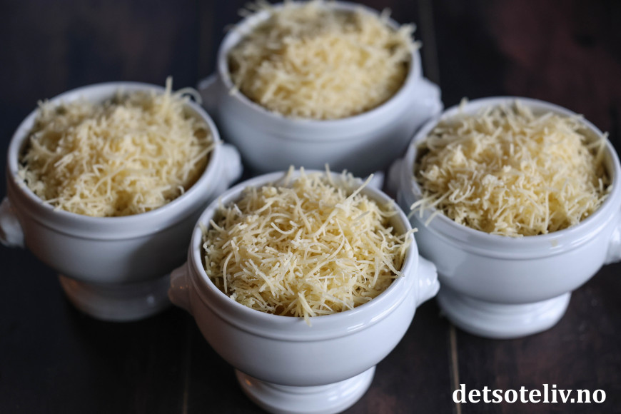 Sett de fylte suppeskålene midt i stekeovnen ved 200°C i ca. 20 minutter. Osten skal bli skikkelig smeltet og få en gyllenbrun skorpe.