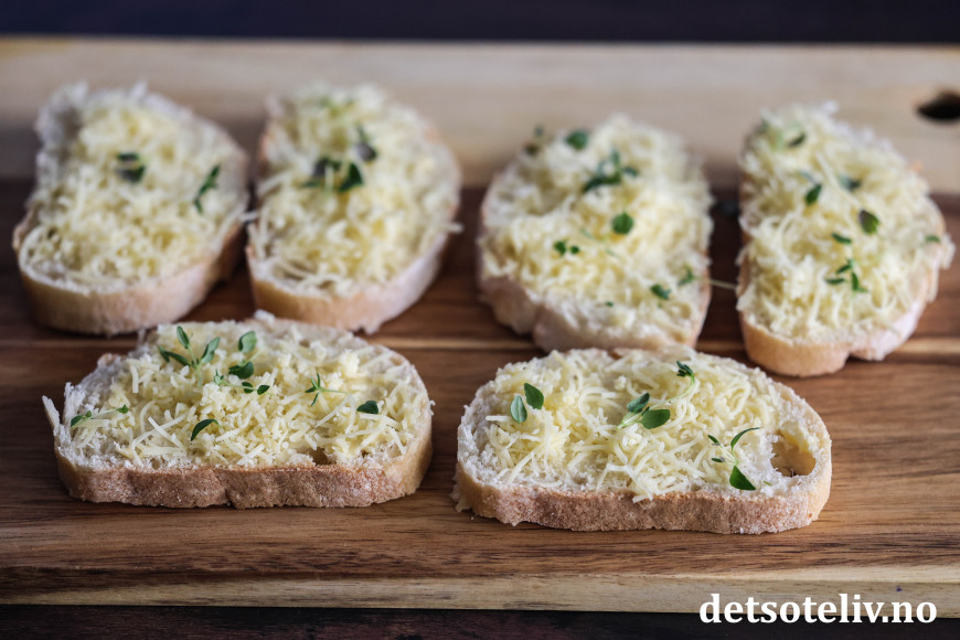 Hvis du vil servere ostetoast ved siden av suppen, smører du loffskiver med smør og drysser på revet ost og eventuelt litt timian.